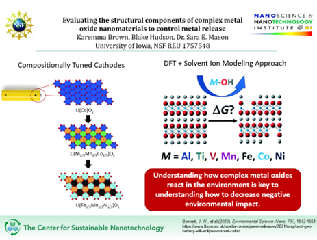 From that discovery, they decided next to swap the transition metals of lithium cobalt oxide with metals that formed more stable oxides and to compare their metal release to NMC, with the goal of finding the right recipe of metals in these oxides that would have low cation release. This summer, we continue this inquiry with the evaluation of the structural components of these complex metal oxides to control metal release, so that the next generation of battery materials will not have a negative environmental impact.